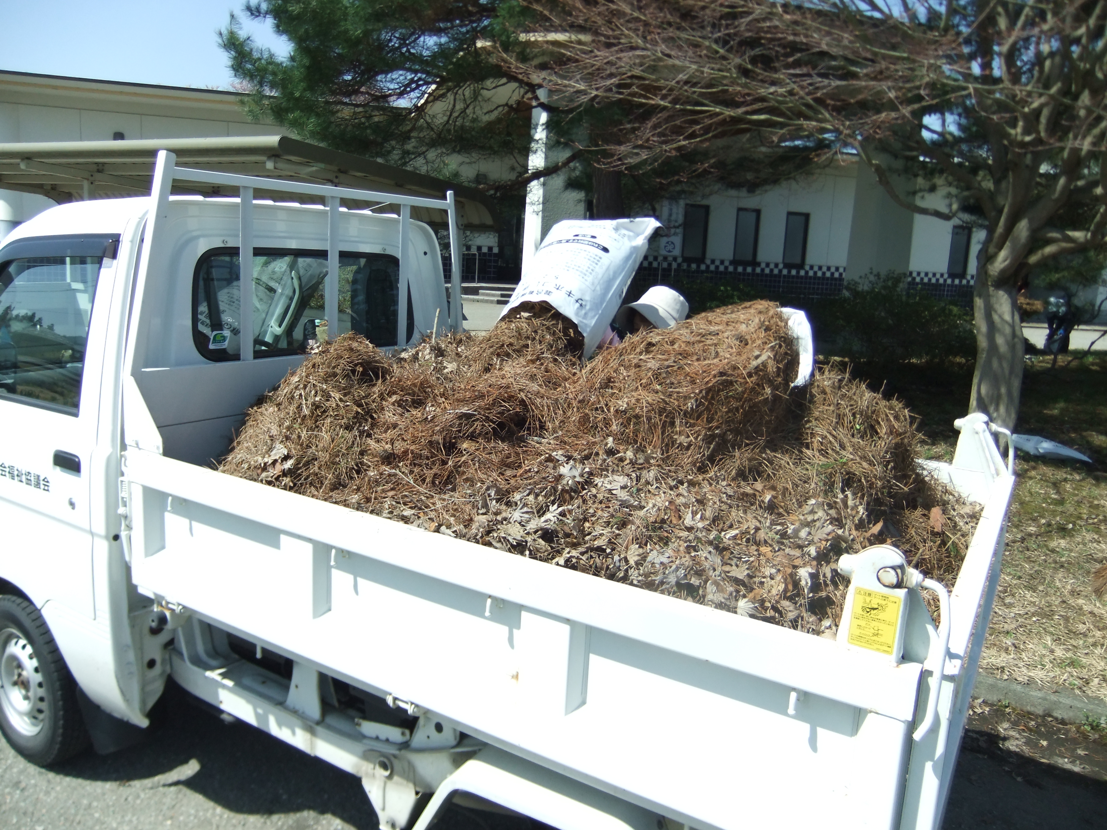 ・手分けして落ち葉を集めます。 ・軽トラの荷台が落ち葉でいっぱいになりました。