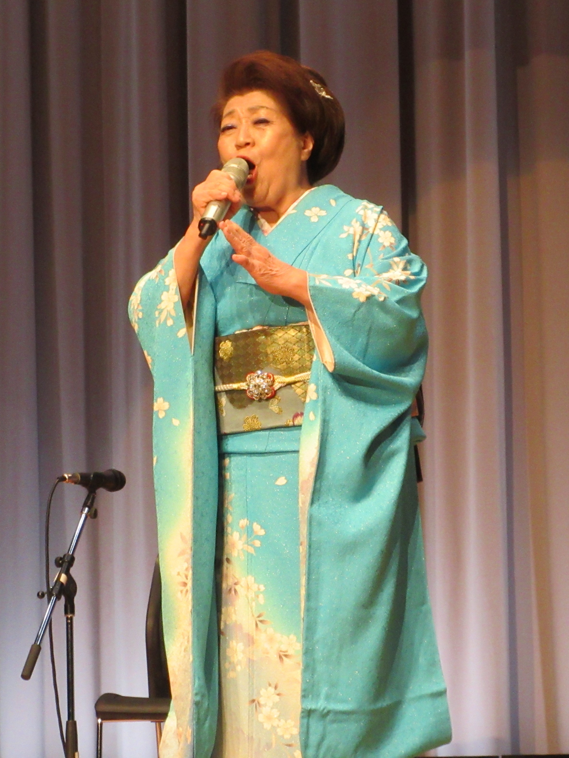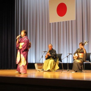 式典後のアトラクションでは、小野花子さんによる民謡バラエティーショーが披露されました。三味線や尺八の演奏に合わせて、迫力ある歌声で「秋田船方節」や「秋田長持唄」を熱唱。終盤には観客のリクエストに応え、「長者の山」を歌い上げ、会場は大いに盛り上がりました。
